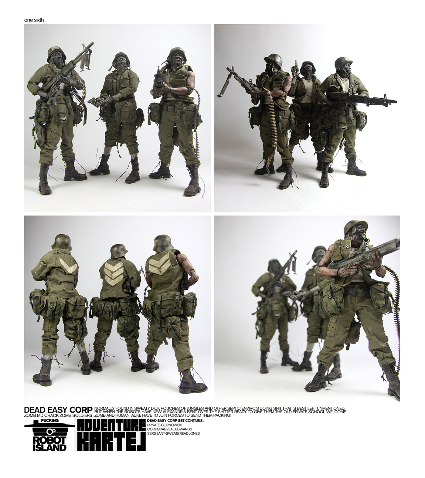 3A于日前公布,AK DEAD EASY CORP ZOMB MD CRACK ZOMB SOLDIERS,僵尸士兵套装将于9月13日发售。此套装包含3只1:6的僵尸士兵,其军衔和所持武器均不相同。