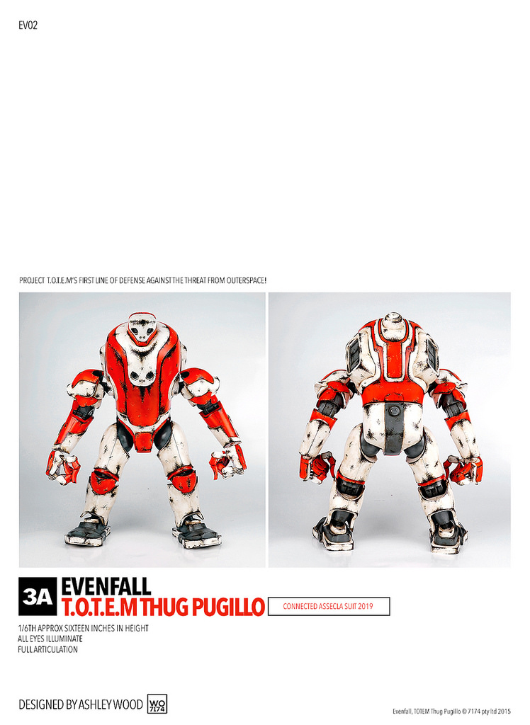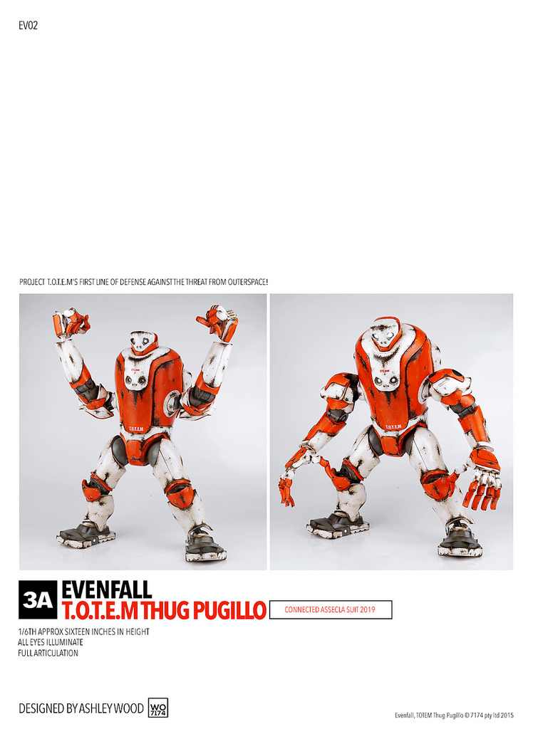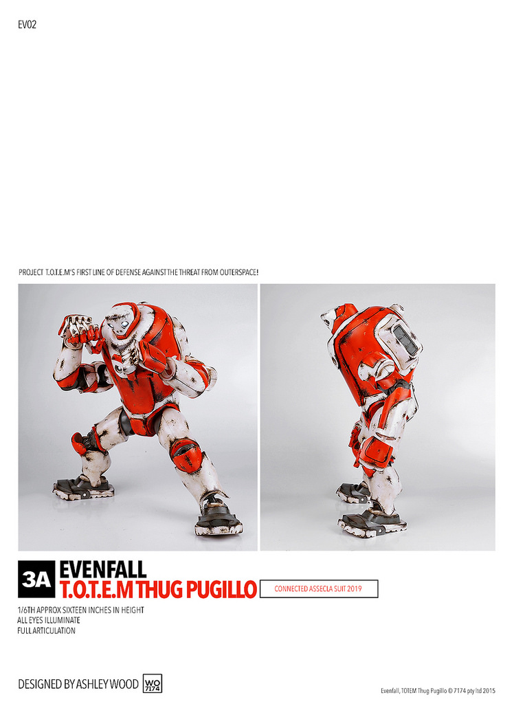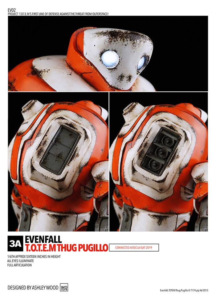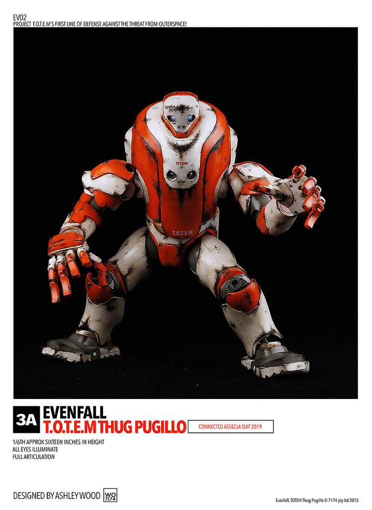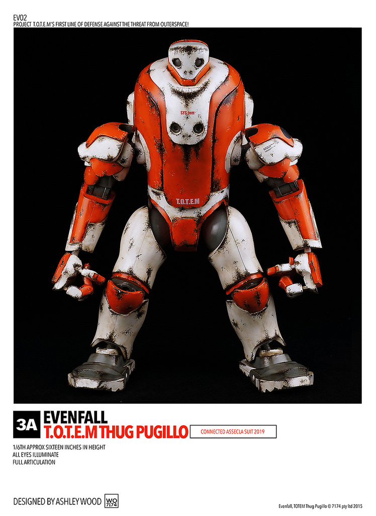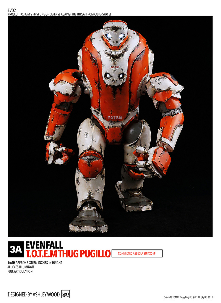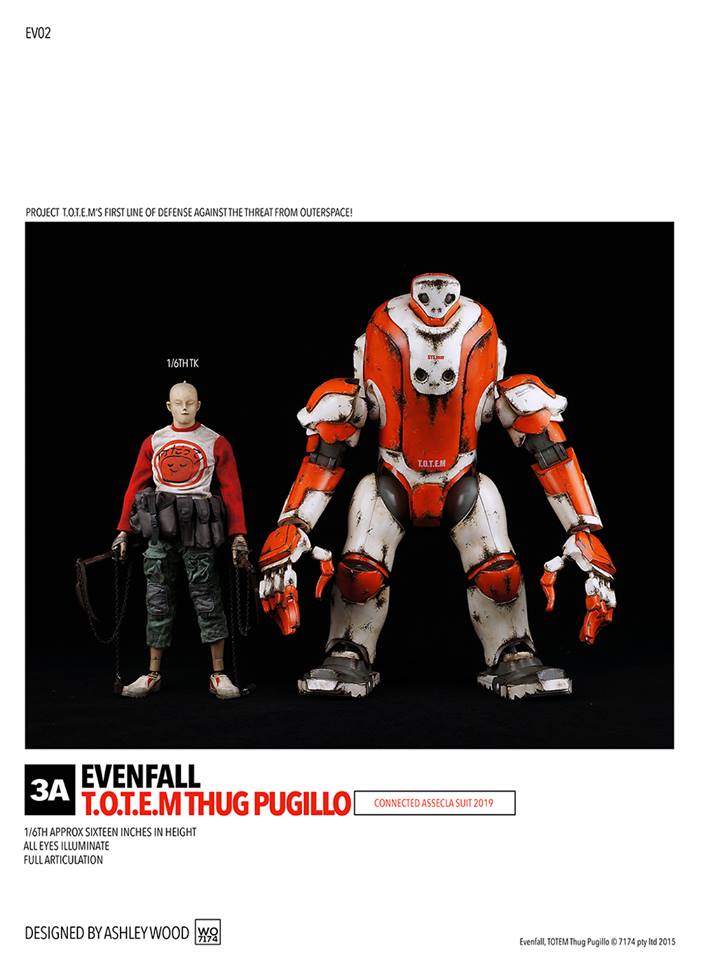 EVENFALL T.H.U.G暴徒装甲(T.O.T.E.M THUG PUGILLO),比例为1:6,全高约16寸(40.6cm),眼睛可发光,全身可动!作品将于4月3日于BAMBALAND开订,官方售价320USD。