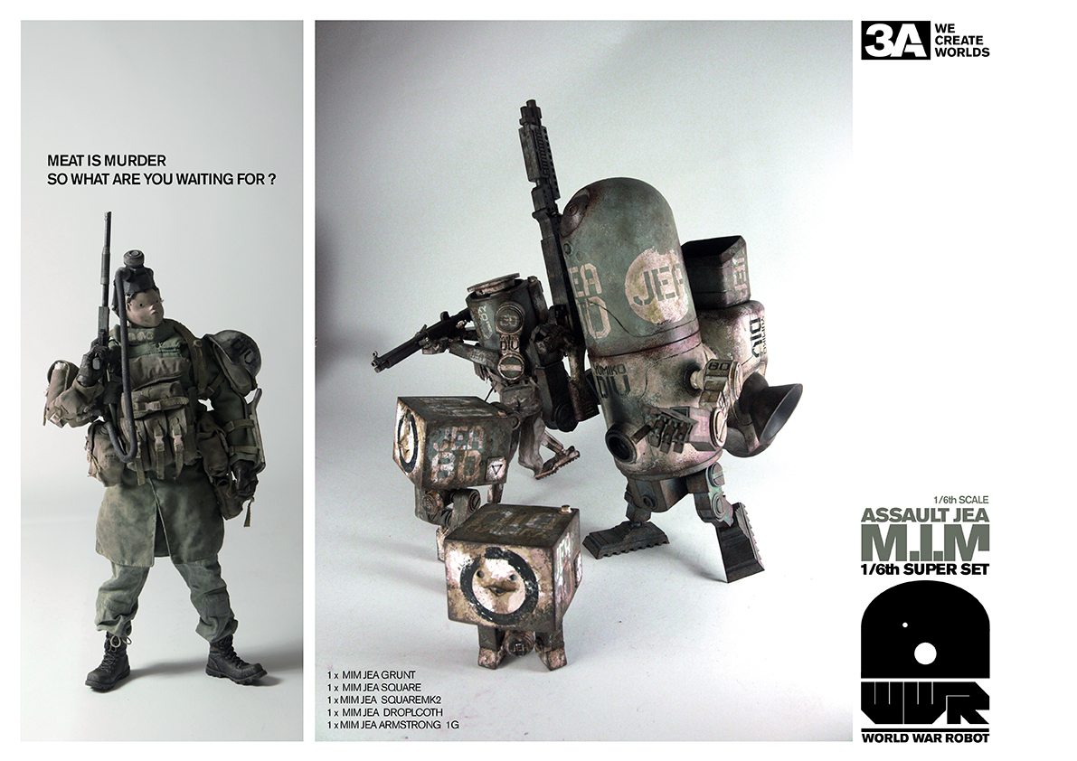 3A将于2013年2月8日,中国农历除夕前的小年夜,发售WWR Meat is Murder JEA套装。套装尺寸为1:6,包含JEA配色的Armstrong,Dropcloth,Square和Square MK2各一只。
