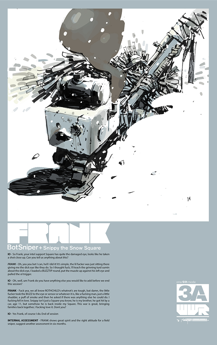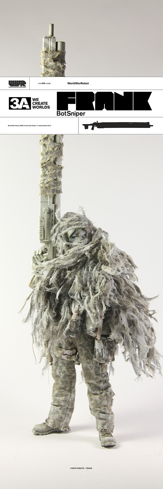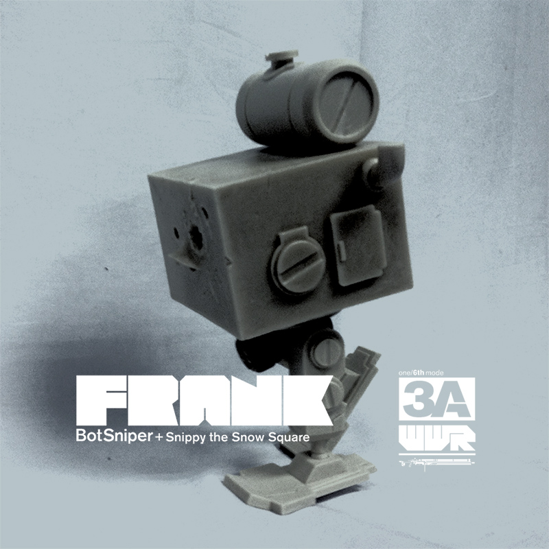 3A TOYS计划于2013年发售4月5日发售雪地狙击手(Botsniper)Frank。和先前的丛林狙击手一样,雪地狙击手也配备了吉利服(身上的伪装网);并且为了应对特殊的作战环境,还配备了一幅雪盲镜;此外,Frank还有一只雪地配色的Square MK1(短腿方块)支援。