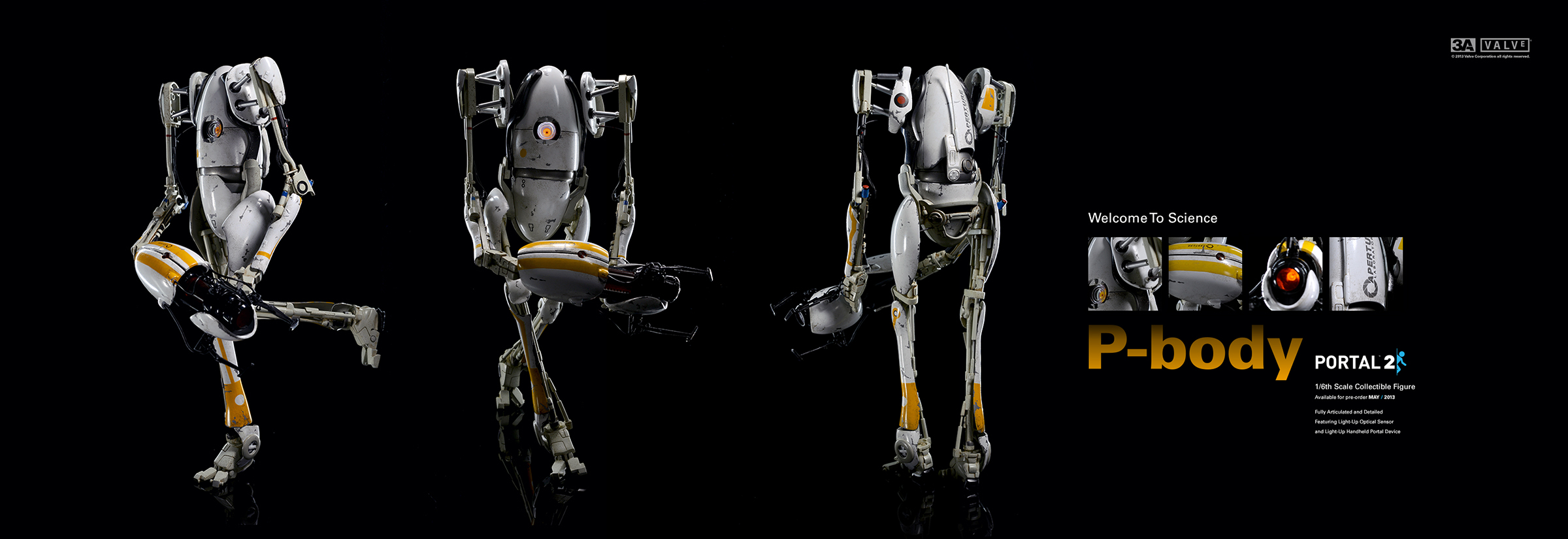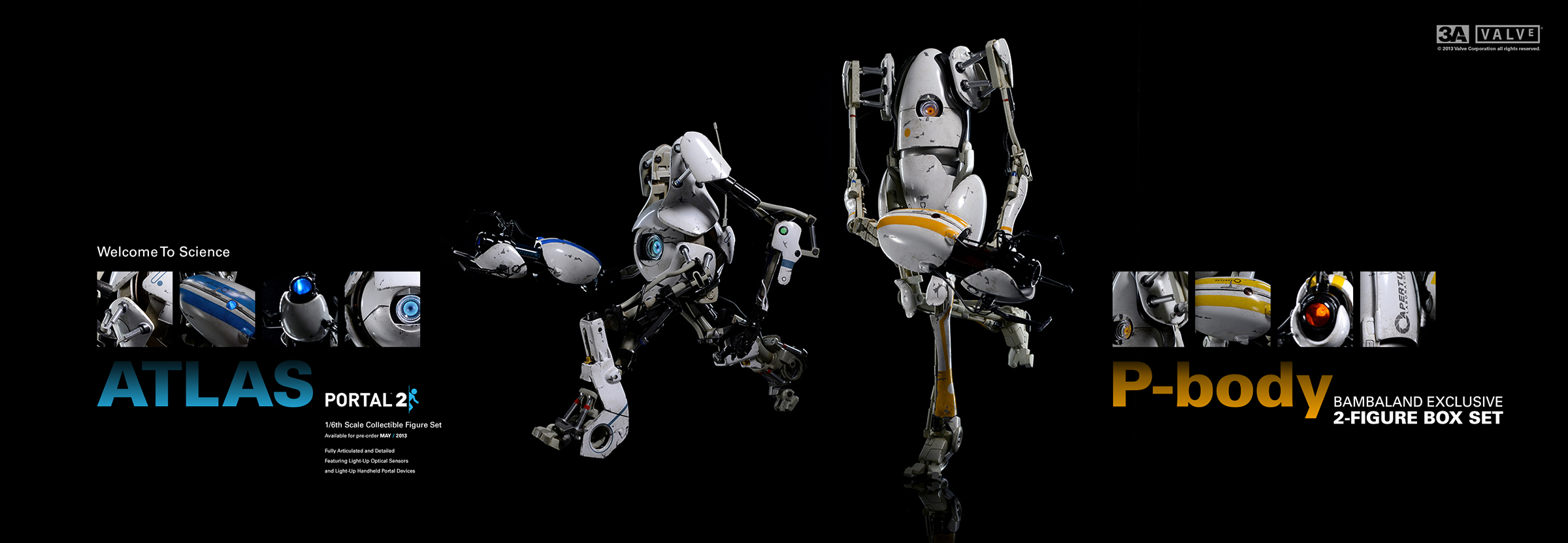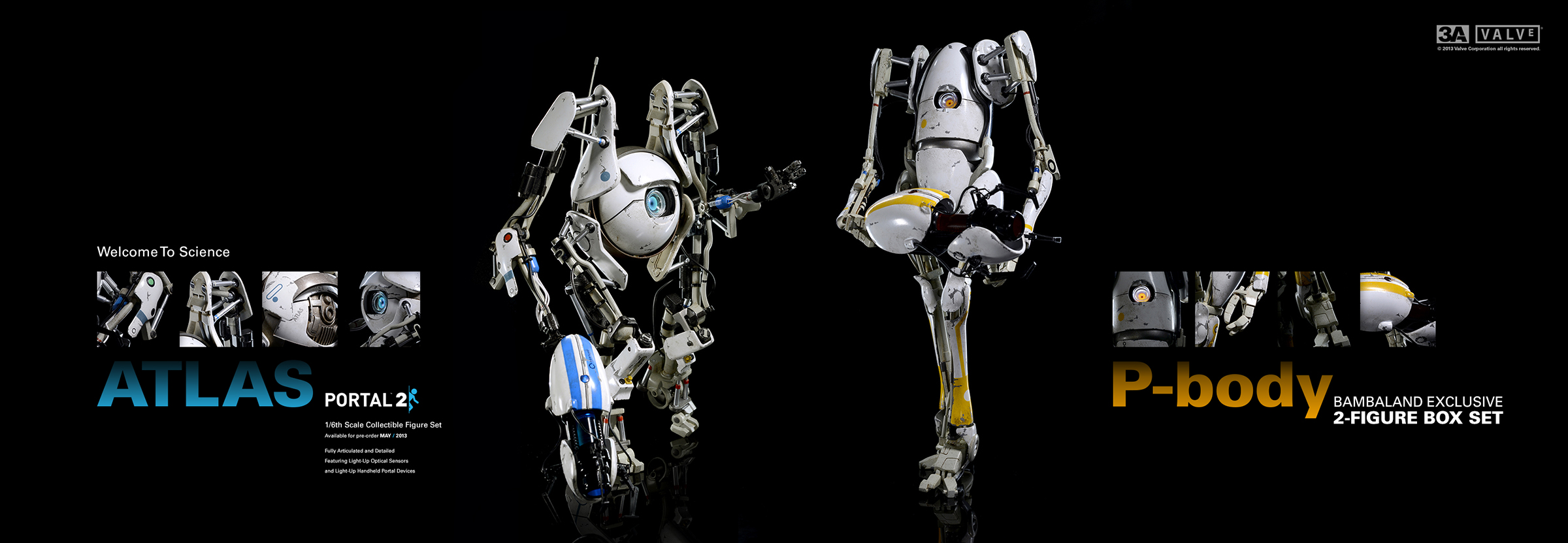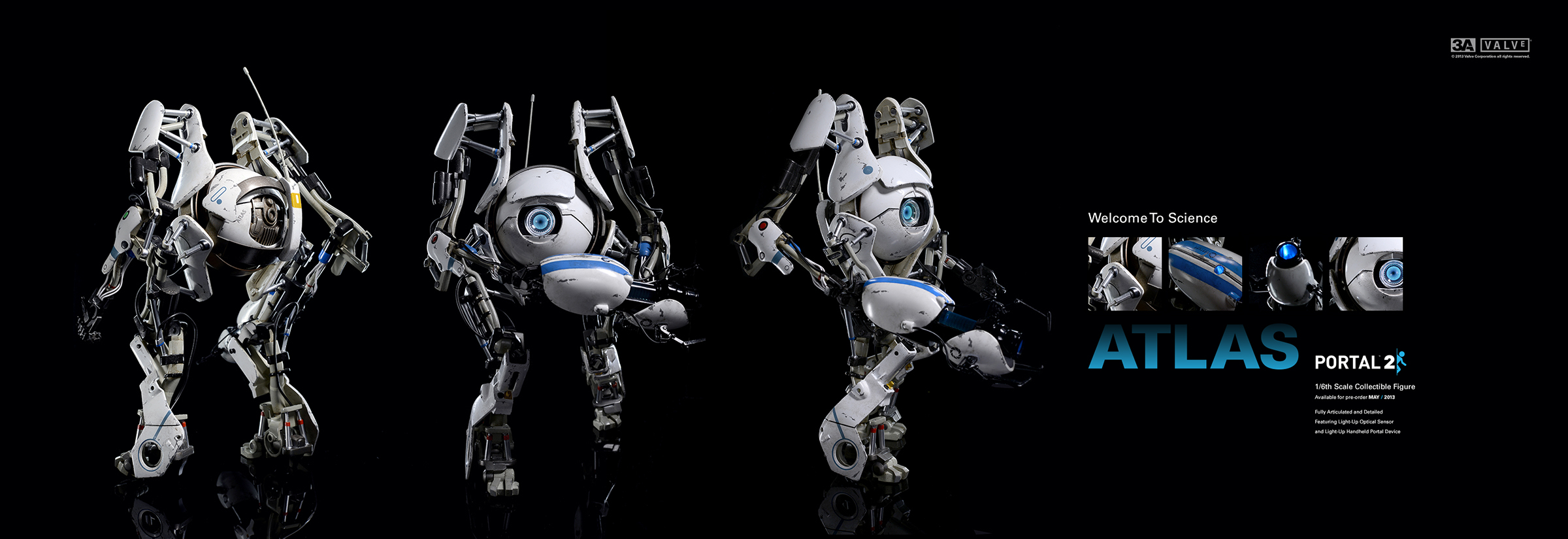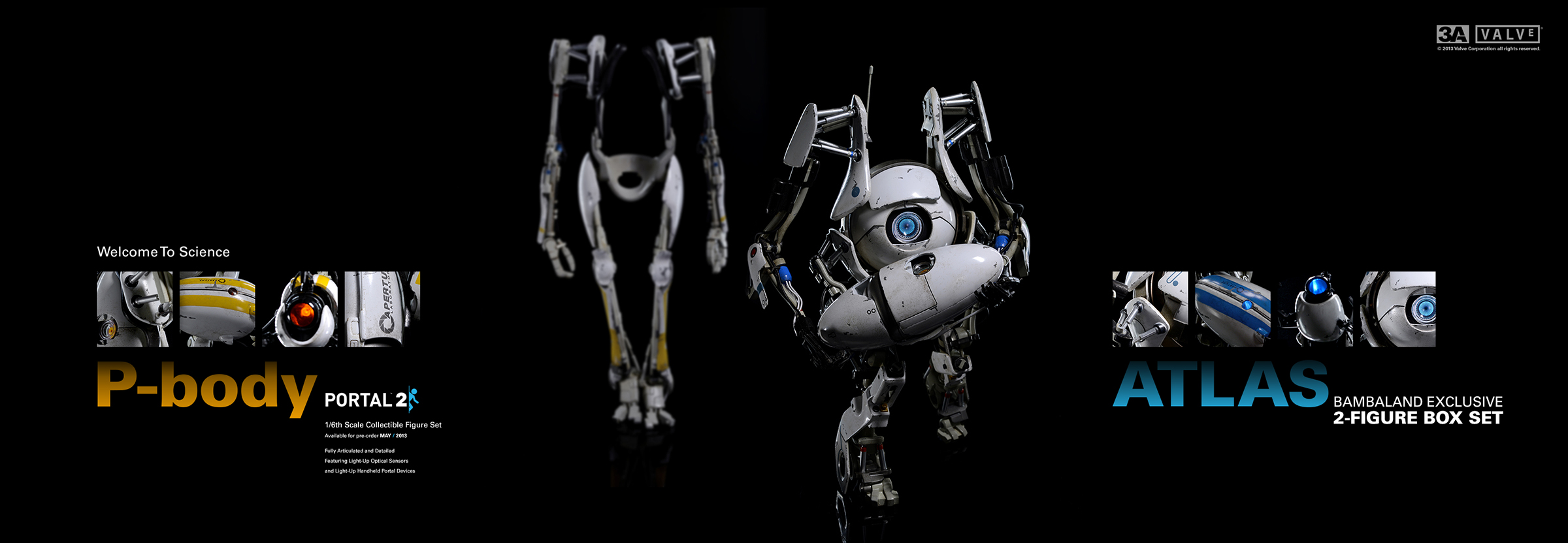 3A TOYS与Valve于去年展开合作,于去年的SDCC(圣地亚哥动漫展)上推出过一款Valve方块,和一只塑胶三明治。随后不久,Valve方块又在Steam平台上发售过一次。紧接着,3A TOYS公布了与Valve合作的下一款产品,《Portal 2》传送门游戏中的两台机器人Atlas和P-body。此二款机器人已于去年公布了实物,并多次在3A展出中现身。