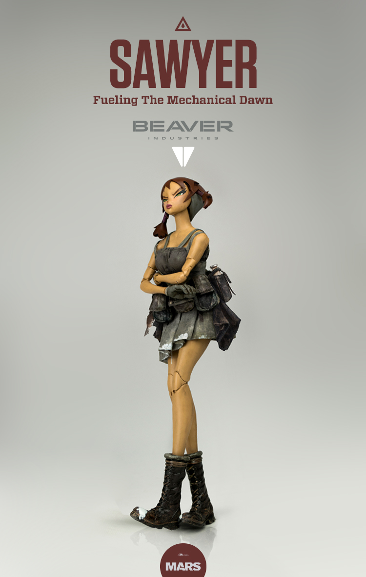 由 3A TOYS 美女设计师Crystal-Jade 操刀的新系列:BEAVER INDUSTRIES,继早前公布的 MILKY BOT 牛奶罐机器人 之后,即将推出新女偶 Sawyer/索耶,作品为1/6全可动人偶,全高12英寸(30.48cm),具备精细的服装、附带燃料枪,平板托盘,逃生绳索。