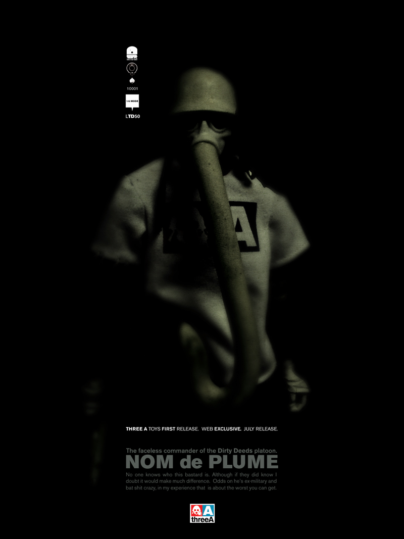 根据Ashley Wood的解释,虽然不同外形的NOM de PLUME有着不同的名字,可实际上都是同一个人物的不同伪装。但是JUNG de PLUME发布后,又说这是一个完全不同的人物。后来的Fallen de PLUME的发布则把事情弄得更复杂了。。。现在,根据Ashley Wood最近一次在3A官方论坛的陈述,只有NOM de PLUME和NOIR de PLUME是同一个人,其他每种外观的都是各自独立的人物。