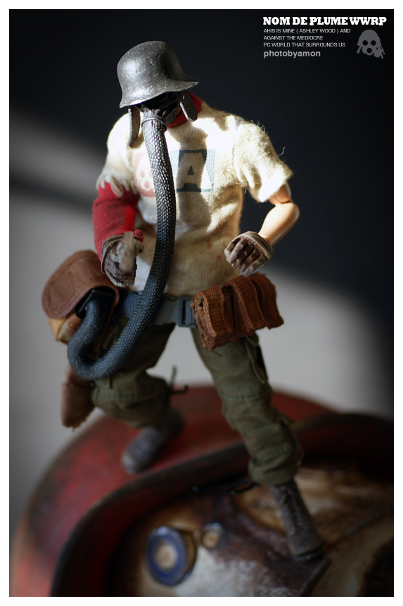NOM de PLUME是World War Robot系列中的一个角色,也是WWR发售的第一个角色。他的所属阵营不明,尽管人们认为他曾经一度是N.O.M.的成员,但不清楚后来是否有叛逃。NOM de PLUME有一些特殊能力,他可以和机器人交流,可以改变皮肤颜色。根据背景设定,没人见过NOM de PLUME面具下的真面目,因此玩偶的面具和头盔也是无法拆卸的。