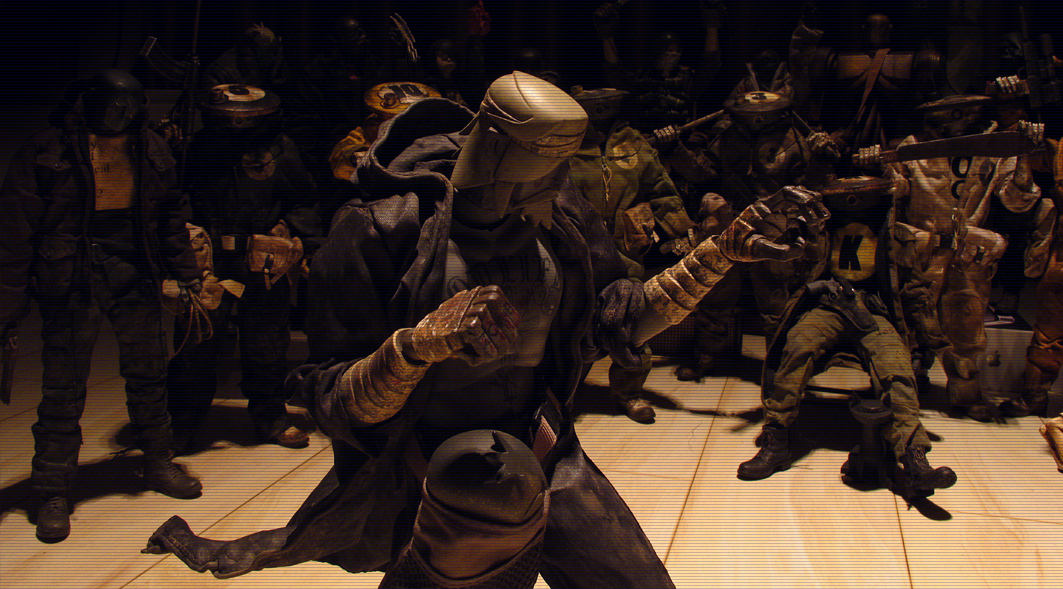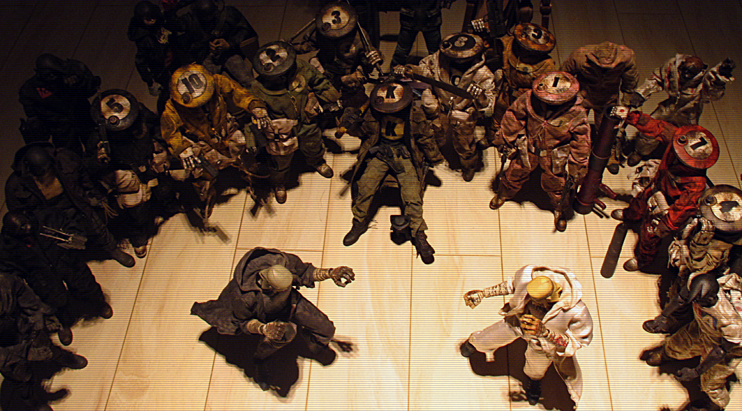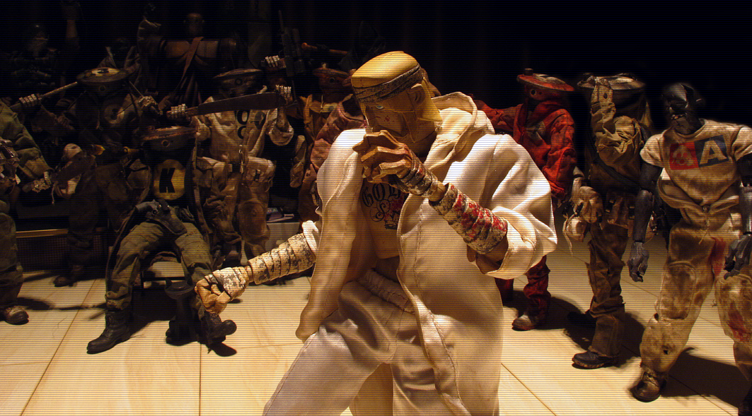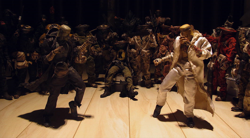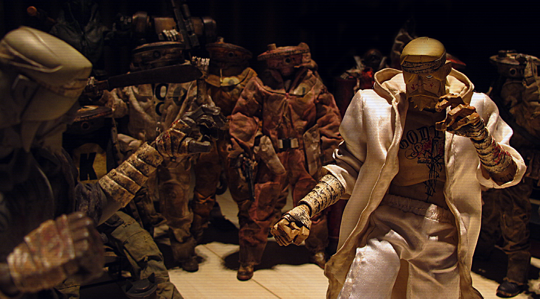 来自网友重庆老男孩的一组照片,出动了超过20名“演员”,主演是两位JC,配角是手指帮,还有僵尸、popbot和小影子等临时演员,在昏暗的灯光下,摆出一台“地下黑拳”的大戏。